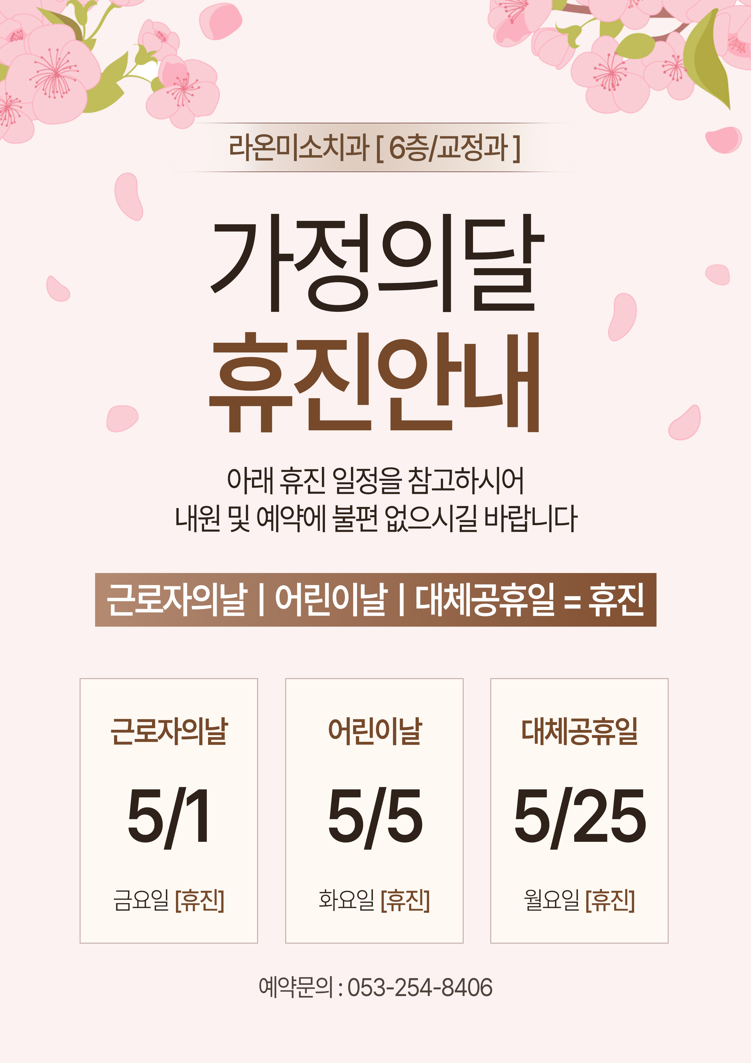 다가오는 5월 가정의 달을 맞아 본원의 휴진 일정을 안내드립니다.
